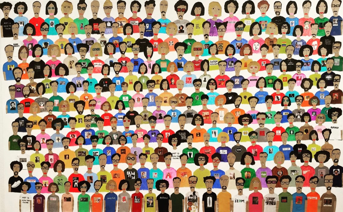 Acrylic, paper collage and ink cut out drawings decoupage on canvas 40x60 inches